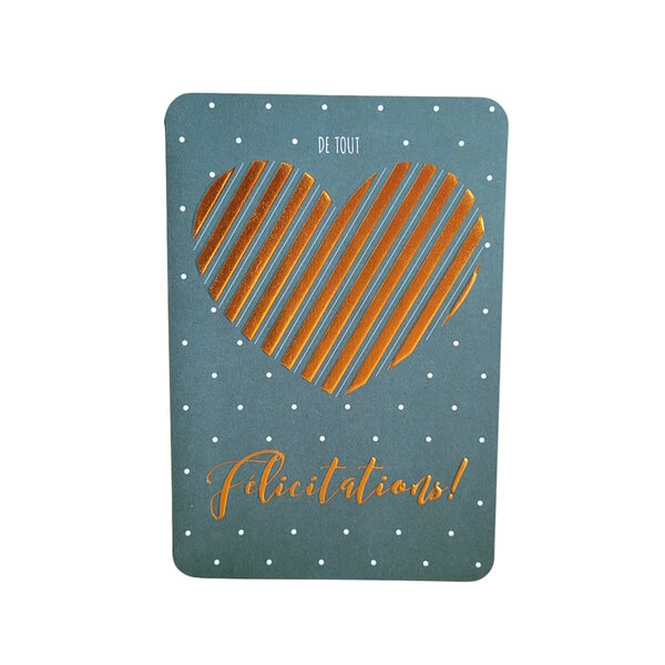 Détails : Carte de voeux et son enveloppe Dimensions carte : 17 x 11.5 cm Thème : Evénement de la Vie Modèle : De Tout Coeur Félicitations !