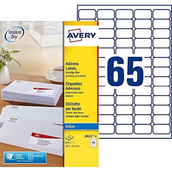 5 x AVERY Etiquette d'adresse jet d'encre, 38,1 x 21,2 mm, blancbord tout autour, coins arrondis,pour imprimante jet d'encrecontenu: 975 étiquettes sur 15 feuilles A4(J8651-15), PHOTOS NON CONTRACTUELLES