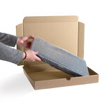 Boîte carton avec couvercle charnière type boîte à pizza- Qualité simple cannelure.- Bonne finition avec extérieur écru (marron)- Très Bonne résistance.- Idéal pour vos expéditions en colis postal.- Très pratique pour vos grands cadres photos, livres photos, albums photos, calendriers, etc.- 100% recyclable.- Livré à plat = gain de place pour le stockage.Le meilleur rapport qualité/prix en terme de protection et de résistance !*dimensions intérieures
