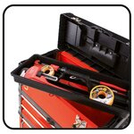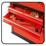 Ce chariot à boîtes à outils YATO se compose de 3 modules, parfaits pour organiser et transporter vos outils d'atelier. Le module supérieur est une boîte à outils classique avec une capacité de charge de 20 kg. Il dispose de 2 organisateurs intégrés et d'un plateau à outils. Le module central dispose de 2 tiroirs métalliques, chacun avec une capacité de charge de 5 kg. Les tiroirs sont montés sur glissières métalliques avec roulements à billes. Le module inférieur est équipé de roulettes intégrées, d'une poignée télescopique en aluminium et d'un grand tiroir basculant. La capacité de charge du module inférieur est de 15 kg. Les modules ont un dessus plat qui peut être utilisé comme plan de travail. De plus, ils ont une rainure pour percer ou enfoncer des vis. Les modules sont également dotés de poignées confortables et antidérapantes pour un levage facile et des coins inférieurs antidérapants. Les modules supérieur et central ont des attaches métalliques pour se connecter en ensembles, et la poignée en aluminium a un blocus fixant les modules. Il est possible d'étendre cet ensemble de 3 modules à un ensemble de 4 modules en ajoutant un module central YT-09107/YT-09108 (non inclus).Couleur : rouge et noirMatériau : acier, PP, aluminiumDimensions totales : 52 x 32 x 72 cm (L x l x H)Capacité de charge : 20 kg + 15 kg + 5 kg x 2Module supérieur avec 2 organiseurs et un plateau à outilsModule central avec 2 tiroirs en métalModule inférieur avec un grand tiroir basculantTige de verrouillage en métalRoues intégréesManche télescopique en aluminium