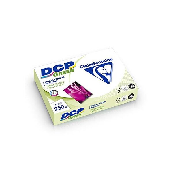 50010SC 210x297 250g DCP Green 125F, Papier 100% recyclé haute blancheur (145 CIE), Spécialiste de l'impression couleur, Excellente fidélité de reproduction d'images, Certifié FSC recyclé, Ange Bleu et Ecolabel Européen, Fabrication française.